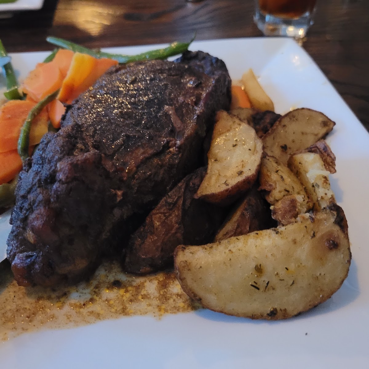 Went there on a Monday night whim because I wanted some fish. I had the fish and chips, but swapped for sweet potato fries and my spouse had the burger and fries. Both were really good. We aren't drinkers and open for water and coffee. Nice atmosphere, 12 people at the bar on a Monday night, not bad.